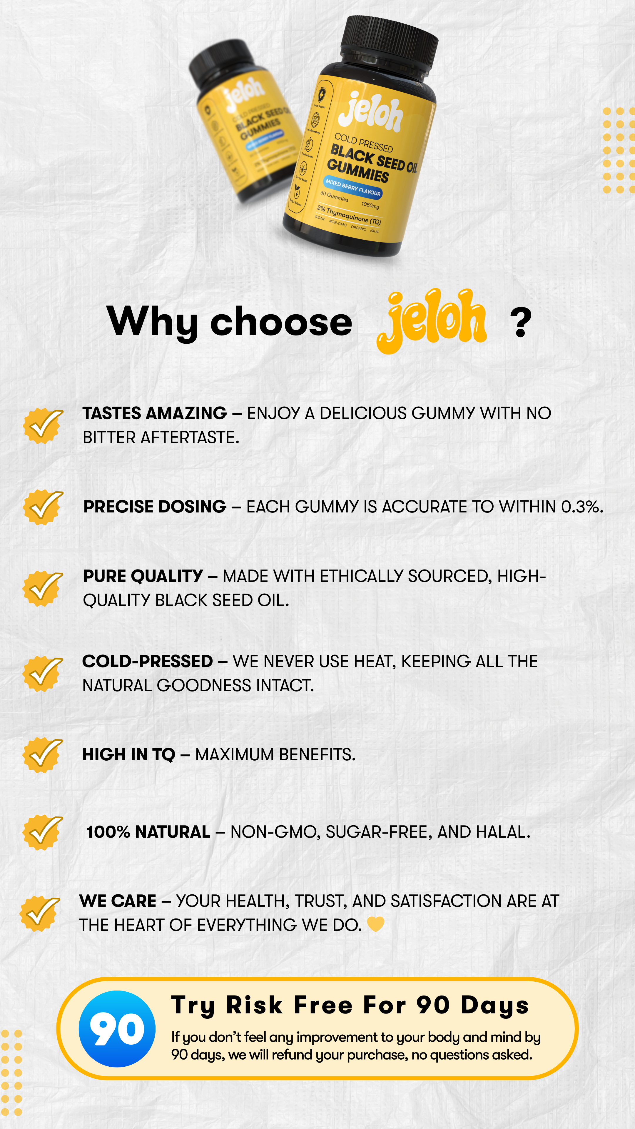 Try jeloh risk-free. If you don’t feel a difference in 90 days, we’ll give you your money back - no questions, no returns, no hassle.